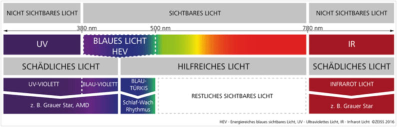 Blau-violettes Licht ist zwar weniger energiereich als UV Licht, dringt aber fast ungefiltert durch das Auge auf die sensible Netzhaut, während UV Licht durch die Linse nahezu absorbiert wird. Zu viel UV und blau/violettes Licht kann die Augen schädigen. Es kann nicht nur zu schmerzhaften Entzündungen der Binde- und Hornhaut führen, sondern auch zu chronischen Schäden, wie Schädigungen der Augenlinse (Grauer Star bzw. Katarakt), insbesondere der Netzhaut (Maculadegeneration).
